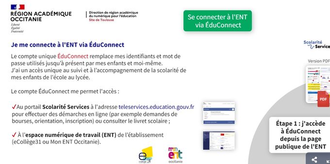 Afin de pouvoir se connecter à l'ENT ainsi qu'aux téléservices, les élèves et les parents de l’académie de Toulouse devront utiliser leur compte Educonnect pour s’authentifier.